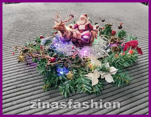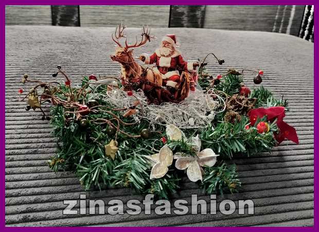 Dit kerstukje heeft in het midden een kerstman met rendier
